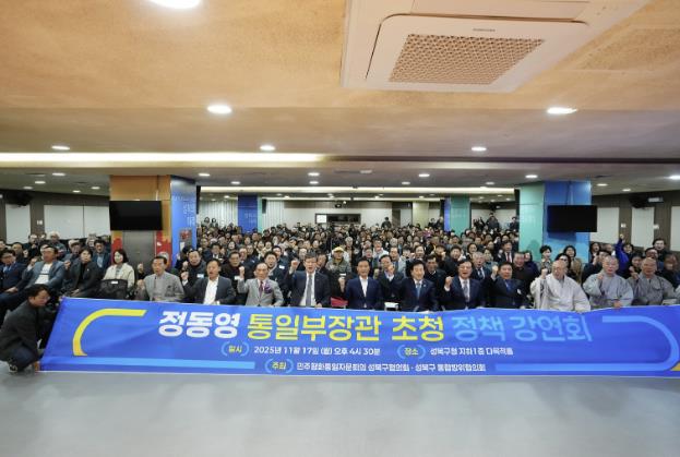 [뉴스앤톡] 민주평화통일자문회의 성북구협의회와 성북구 통합방위협의회가 17일 오후 성북구청 지하 다목적홀에서 정동영 통일부 장관을 초청해 특별 강연회를 개최했다. 이번 강연회는 지역 사회에서 평화통일 담론을 확산하고 지방정부 차원의 남북교류 협력 방안을 모색하기 위해 마련된 것으로, 지역 내 기관·단체 관계자들이 대거 참석하며 높은 관심을 보였다.