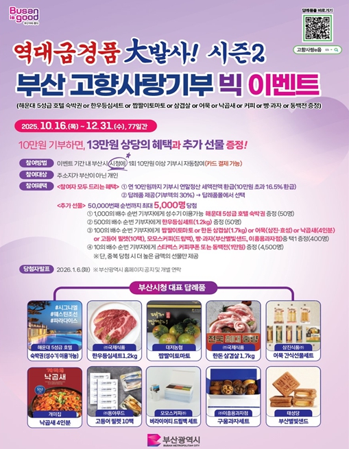 [뉴스앤톡] 부산시는 지난 10월 16일부터 진행 중인 '역대급 경품 대발사 시즌2! 부산 고향사랑기부제 연말 빅 이벤트'에 많은 동참을 당부했다.