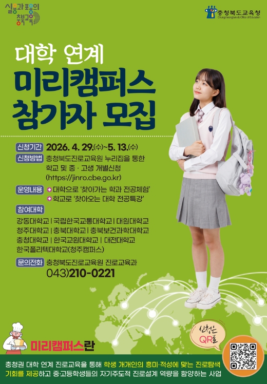 참여 대상은 도내 중‧고등학생 및 동일 연령 청소년이며, 신청은 29일부터 5월 13일까지 충북진로교육원 누리집을 통해 가능하다.