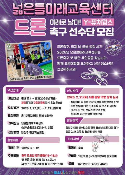 [뉴스앤톡] 양천구는 드론 주행 기술과 스포츠를 결합한 유소년 드론축구단 ‘Y-퓨처윙스’를 창단하고, 하늘 위에서 펼쳐지는 짜릿한 승부를 함께 경험할 창립 멤버를 오는 2월 13일까지 모집한다고 밝혔다.