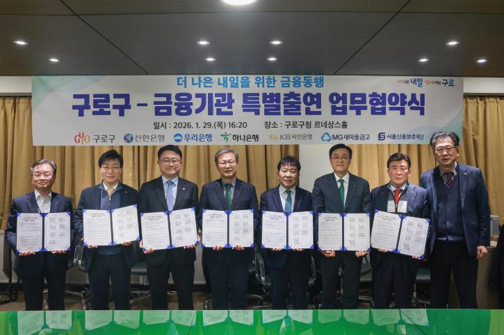 [뉴스앤톡] 구로구가 1월 29일 구청 3층 르네상스홀에서 신한은행, 우리은행, 하나은행, 국민은행, 새마을금고, 서울신용보증재단과 ‘더 나은 내일을 위한 금융동행’ 특별출연 협약을 체결하고, 총 212억 5천만 원 규모의 중소기업·소상공인 특례보증을 추진한다.
