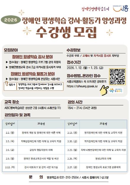 [뉴스앤톡] 시흥시는 오는 1월 23일까지 ‘2026년 장애인 평생학습 전문 강사와 활동가 양성 과정’ 수강생을 모집한다.