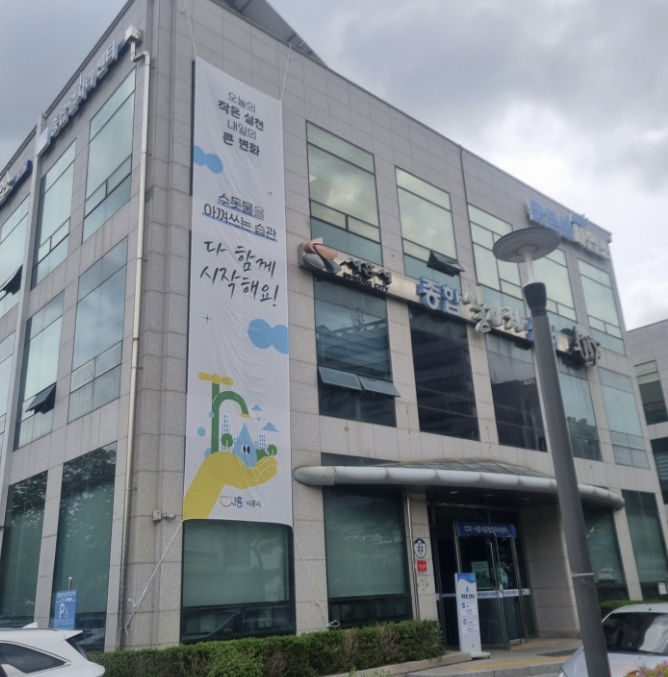 | ▲ 맑은물사업소 청사에 게시된 물 절약 실천 및 독려 현수막 |