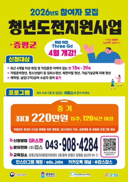 신청은 홍보물에 안내된 QR코드를 통해 가능하며, 세부 일정과 프로그램 관련 문의는 수행기관인 ㈜잡스로 하면 된다.