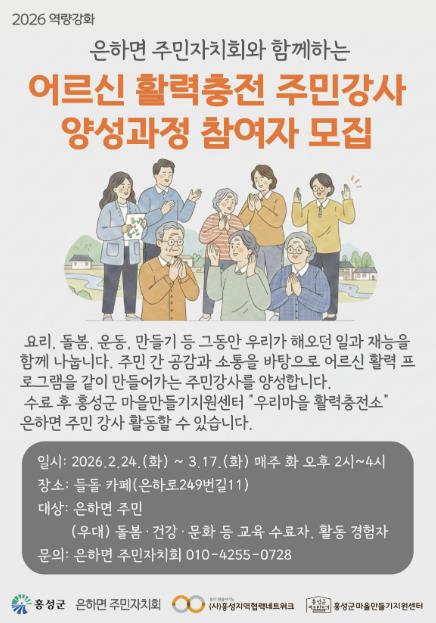 [뉴스앤톡] 홍성군 은하면 주민자치회는 홍성군 마을만들기 지원센터와 함께 지역 내 어르신 돌봄과 마을 공동체 활성화를 위해 ‘어르신 활력충전 주민강사 양성과정’ 참여자를 모집한다.