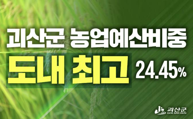 군이 23일 공개한 2026년 시·군별 예산 현황에 따르면 괴산군의 본예산 대비 농업 부문 예산 비율은 24.45%로 충북 11개 시·군 가운데 1위에 올랐다. 도 전체 평균(11.86%)과 비교해도 두 배를 훌쩍 넘는 지원이다.
