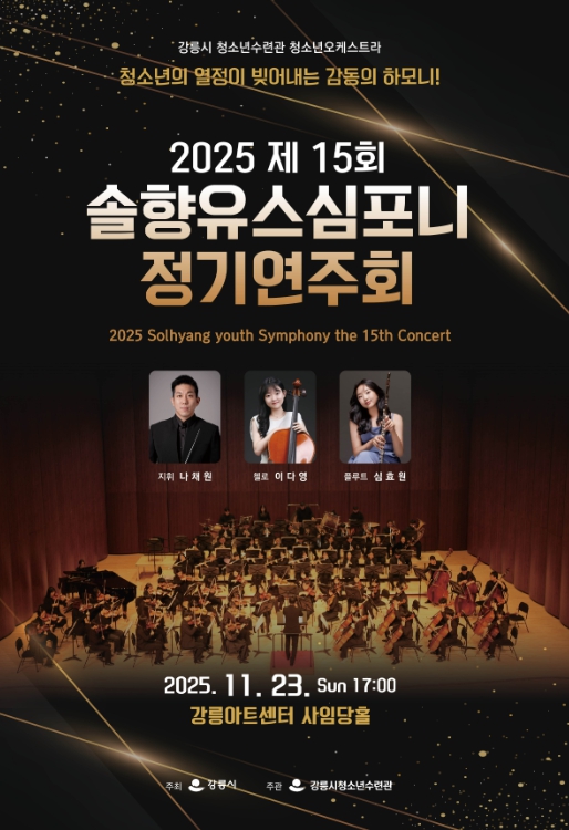[뉴스앤톡] 강릉시 청소년수련관은 오는 11월 23일 오후 5시부터 6시 30분까지 강릉아트센터 사임당홀에서 ‘제15회 강릉시 청소년오케스트라 솔향유스심포니 정기연주회’를 개최한다.
