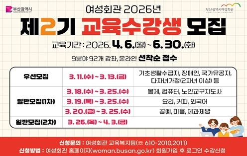 [뉴스앤톡] 부산시 여성회관은 오는 3월 11일부터 '2026년 제2기 교육과정' 수강생을 모집한다고 밝혔다.