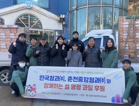 [뉴스앤톡] 한국청과(주)와 춘천중앙청과(주)(대표이사 박상헌)는 다가오는 설 명절을 맞아 강원특별자치도 내 위탁가정이 보다 따뜻하고 풍성한 명절을 보내길 바란다며, 2월 9일 강원가정위탁지원센터에 과일 400박스(약 2,000만 원 상당)를 후원했다.