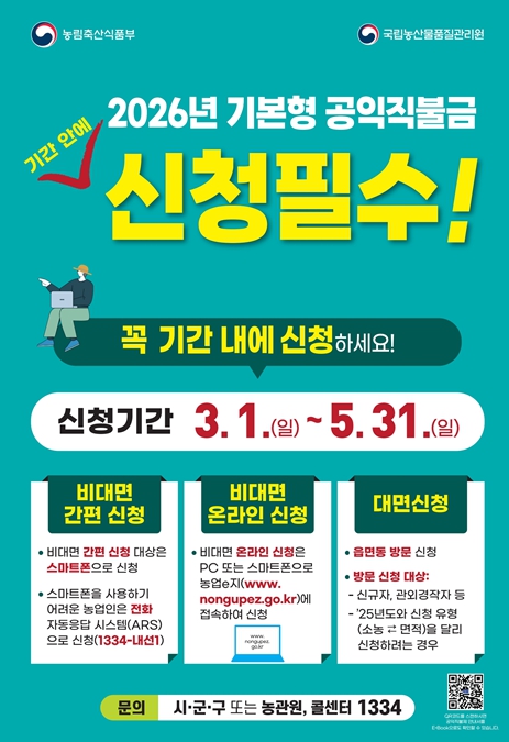 [뉴스앤톡] 강원특별자치도는 2026년 기본형 공익직불금 신청을 3월 1일부터 5월 31일까지 3개월간 접수한다고 밝혔다.
