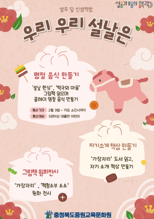 2월에는 ‘명절’을 주제로 '우리 우리 설날' 프로그램을 운영해 ▲설날 한상 ▲떡국의 마음 등 도서를 읽고 명절 음식을 클레이로 만들어보는 체험형 교육을 진행한다.