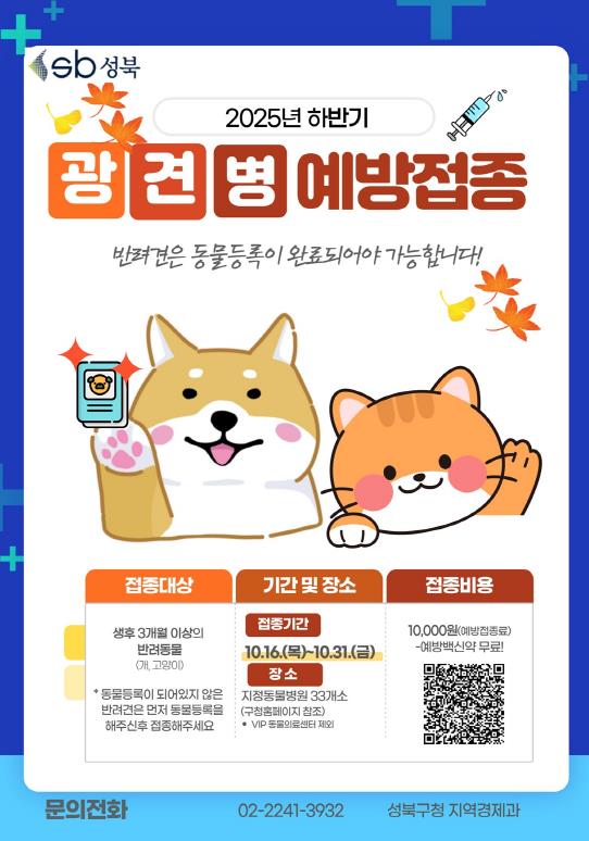 성북구 내 33개 지정 동물병원(VIP동물의료센터 제외)에서 접종을 받을 수 있으며, 상세한 병원 명단은 성북구청 홈페이지 ‘구정안내-새소식’에서 확인하거나 지역경제과로 문의하면 된다.