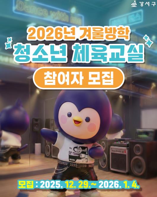[뉴스앤톡] 서울 강서구는 겨울방학을 맞아 관내 청소년들의 체력 증진과 건전한 여가생활을 돕기 위해 ‘2026년 겨울방학 청소년 체육교실’을 운영한다고 밝혔다.