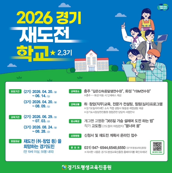 [뉴스앤톡] 경기도와 경기도평생교육진흥원은 취업이나 창업 실패를 경험한 도민의 재기를 지원하기 위해 오는 20일부터 ‘2026년 경기 재도전학교’ 2~3기 참가자를 각각 55명 내외로 모집한다.