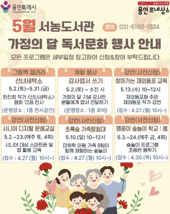 [뉴스앤톡] 용인특례시 서농도서관은 오는 5월 가정의 달을 맞아 다양한 세대를 아우르는 프로그램으로 이뤄진 ‘2026년 5월 독서문화행사’를 마련했다고 21일 밝혔다.