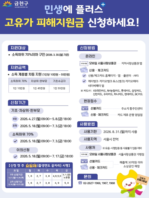 [뉴스앤톡] 금천구는 중동 정세 불안 등으로 촉발된 고유가·고환율·고물가 상황에서 구민의 생활 부담을 완화하고 지역경제를 활성화하기 위해 오는 27일부터 ‘1차 고유가 피해지원금’ 신청 접수 및 지급을 시작한다고 밝혔다.
