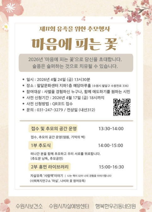 [뉴스앤톡] 수원시자살예방센터가 24일 오후 1시 30분 팔달문화센터 예당마루홀에서 유족을 위한 추모행사 ‘제11회 마음에 피는 꽃’을 연다.