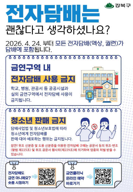 이순희 강북구청장은 “전자담배 역시 금연구역에서 사용할 수 없는 대상이라는 점을 분명히 알리고, 청소년 보호와 간접흡연 예방을 위해 법령 준수가 필요하다”며 “앞으로도 금연 환경 조성과 구민 건강 증진을 위한 정책을 지속적으로 추진하겠다”고 말했다.