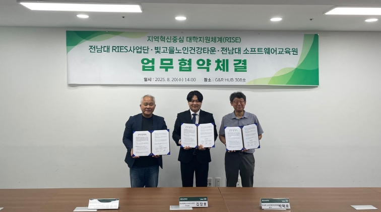 [뉴스앤톡] 전남대 RISE사업단(부단장 김장호), 빛고을노인건강타운(본부장 김용덕), 전남대 소프트웨어교육원(부장교수 박혁로)은 8월 20일(수) 오후 G&R허브 3층 회의실에서 지역혁신중심 대학지원체계(RISE) 기반 상호협력 강화를 위한 업무협약(MOU)을 체결했다.