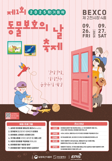 [뉴스앤톡] 부산시는 농림축산식품부와 공동으로 오는 9월 26일부터 27일까지 이틀간 벡스코 제2전시장에서 '제1회 동물보호의 날 축제'를 개최한다고 밝혔다.