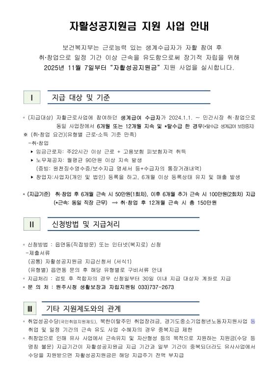 [뉴스앤톡] 원주시는 오는 26일까지 2025년 ‘자활성공지원금’ 신청을 접수한다.