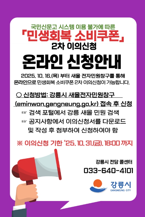 [뉴스앤톡] 강릉시는 국가정보시스템 장애로 인해 국민신문고 시스템 이용이 일시적으로 불가함에 따라, 온라인 민원 접수 불편을 해소하기 위해 새올 전자민원(상담민원) 창구를 통해 ‘민생회복 소비쿠폰 2차 이의신청’을 재개한다.