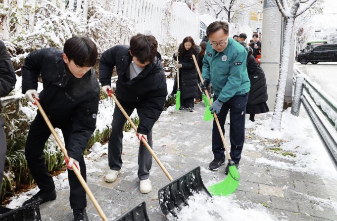 | ▲ 지난해 유성훈 금천구청장과 직원들이 제설 작업을 하고 있다 |