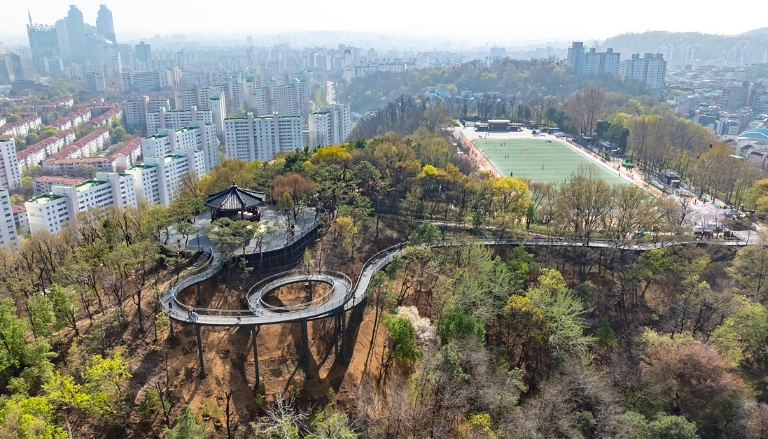 최고의 조망 지점은 용왕정 정자와 어우러진 원형 데크다. 어느 방향에서도 시야의 막힘이 없으며 숲과 도심, 한강이 한눈에 펼쳐지는 파노라마 경관을 감상할 수 있다. 또 야간에는 스카이워크 난간을 따라 설치된 390m의 LED 라인 조명이 점등되며, 곡선 구조의 아름다움과 도심의 화려한 불빛이 만나 낭만적인 야경을 선사한다.