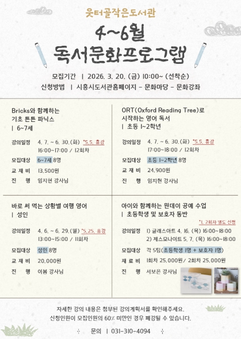 영어 특화 프로그램은 ▲유아 대상 기초 파닉스 과정 ‘브릭스(Bricks)와 함께하는 기초 튼튼 파닉스’ ▲초등 1~2학년 대상 영어 원서 독서 프로그램인 ‘오알티(ORT, Oxford Reading Tree)로 시작하는 영어 독서’ ▲성인 대상 영어 회화 과정 ‘바로 써먹는 상황별 여행 영어’로 연령별 맞춤형 강좌로 구성됐다. 강좌별 모집 인원은 소규모(8명)로 구성해 참여자 중심의 수업이 진행될 예정이다.