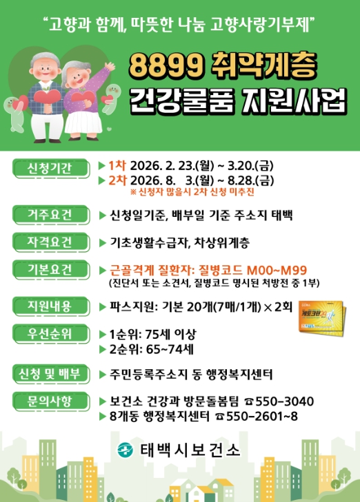 [뉴스앤톡] 태백시는 고향사랑기금을 활용해 관절염 등 근골격계 질환으로 어려움을 겪는 관내 취약계층 어르신을 대상으로 『8899 취약계층 건강물품 지원사업』을 추진한다고 밝혔다.