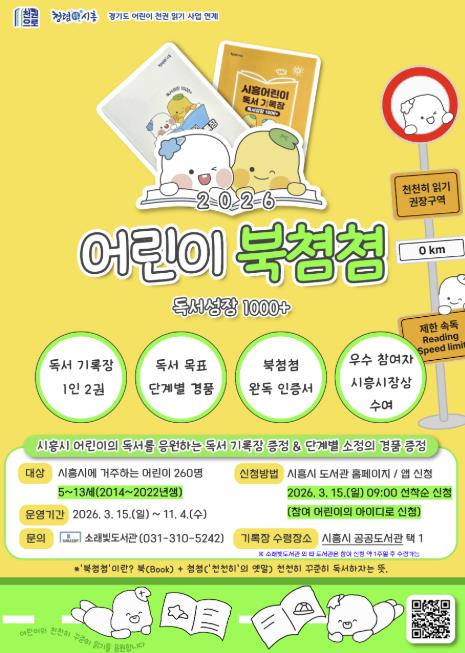 [뉴스앤톡] 시흥시 소래빛도서관은 오는 3월 15일부터 관내 5~13세 어린이 260명을 대상으로 독서 기록장을 배부하고, 우수 참여자 8명에게 시흥시장상을 수여하는 독서사업 ‘2026 어린이 북쳠쳠 독서성장 1000+’를 운영한다.