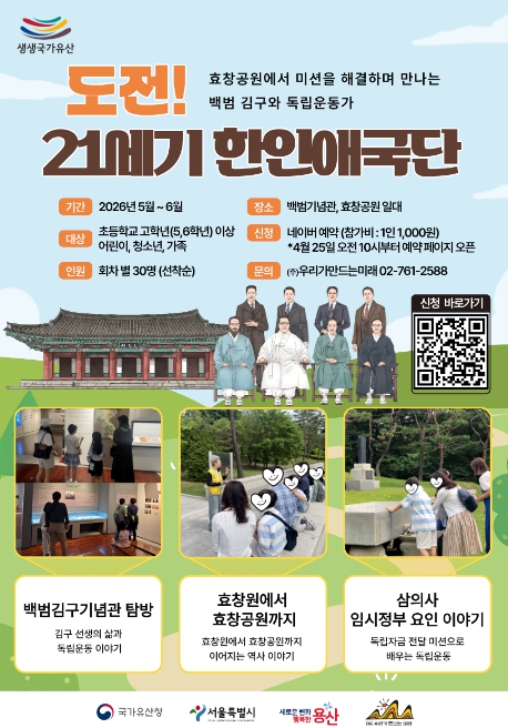 [뉴스앤톡] 서울 용산구가 내달부터 11월까지 지역 내 국가유산 서울 효창공원(효창원로 177-18) 일대에서 ’효창공원이 생생, 독립운동이 생생‘ 프로그램을 운영한다.
