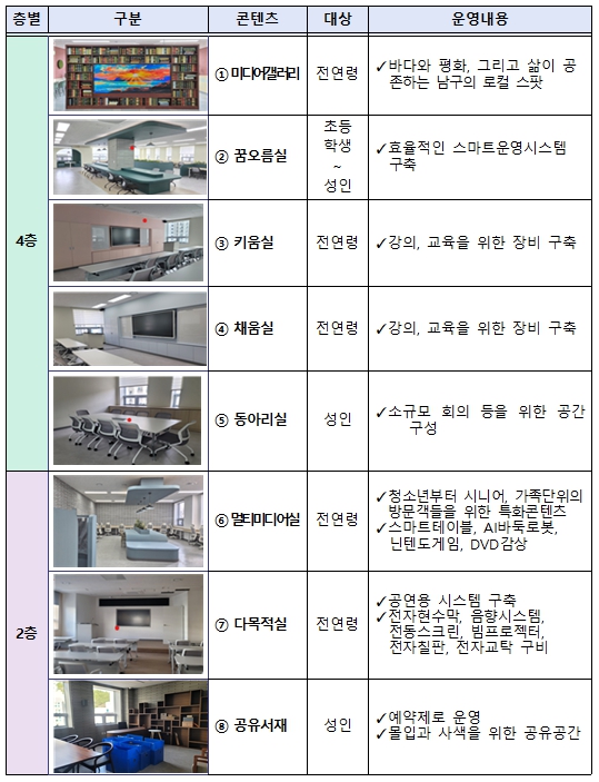 ▲2층 학습·커뮤니티 공간은 온 가족이 함께 즐길 수 있는 스마트테이블, 인공지능(AI) 바둑로봇, 닌텐도 게임공간을 갖추었으며 ▲4층 스마트 강의실은 전자칠판과 태블릿을 활용해 영어 및 코딩 교육 등 미래 인재 양성을 위한 맞춤형 프로그램을 제공하는 공간으로 조성했다.