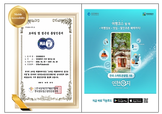 [뉴스앤톡] 인천광역시(시장 유정복)는 스마트관광 플랫폼 ‘인천e지’ 앱(APP)이 관광약자를 배려한 서비스 구현의 우수성을 인정받아, ‘모바일 앱 접근성 품질인증(Mobile Accessibility)’을 3년 연속 획득했다고 밝혔다.