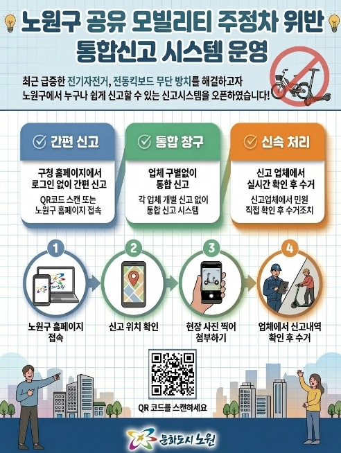 오승록 노원구청장은 “이번 통합 신고시스템 구축은 무단 방치된 공유 모빌리티로 인한 주민 불편을 최소화하기 위한 선제적 조치”라며, “앞으로도 쾌적한 도시 미관을 조성하고, 구민 누구나 안심하고 걸을 수 있는 안전한 보행환경을 만드는 데 최선을 다하겠다”라고 말했다.