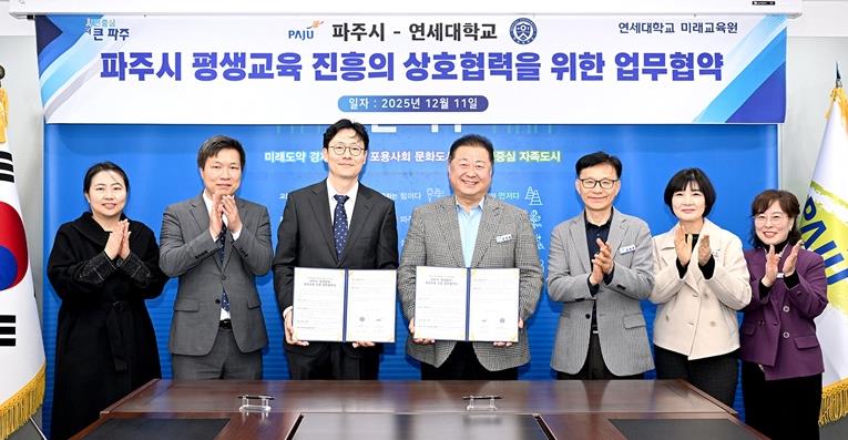 [뉴스앤톡] 파주시는 지난 11일 연세대학교 미래교육원과 ‘일생일대 프로젝트’의 공동 기획·운영을 위한 평생교육 진흥 업무협약(MOU)을 체결하고, 2026년 사업 확대를 위한 협력 체계를 본격 가동했다.