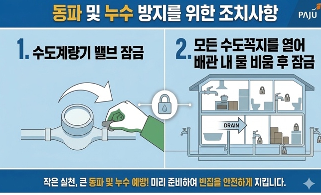 파주시는 겨울철 낮은 기온으로 수도관 동파가 빈번하게 발생하는 지역이며, 최근에는 기후위기에 따른 집중호우까지 겹치면서 계절을 가리지 않는 누수 사고가 지속되고 있다. 특히 장기간 비어 있는 빈집은 관리 사각지대로 남아 누수사고 발생과 요금폭탄 민원의 주요 원인으로 지적되어 왔다.