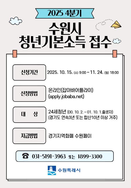 [뉴스앤톡] 수원특례시는 10월 15일 오전 9시부터 11월 24일 오후 6시까지 24세 청년을 대상으로 ‘2025년 4분기 청년기본소득’ 신청을 받는다.