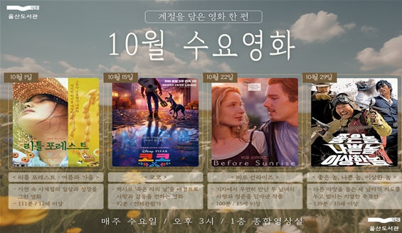 [뉴스앤톡] 울산도서관이 10월 한 달간 매주 수요일 오후 3시 도서관 1층 종합영상실에서 ‘계절을 담은 영화 한 편’을 주제로 영화를 상영한다.