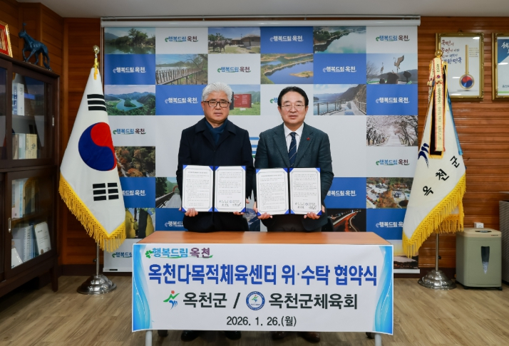 [뉴스앤톡] 옥천군은 26일 지역 생활체육의 새로운 거점이 될 ‘옥천다목적체육센터’의 효율적인 관리와 전문적 운영을 위해 옥천군체육회(회장 이철순)와 위·수탁 협약을 체결했다고 밝혔다.