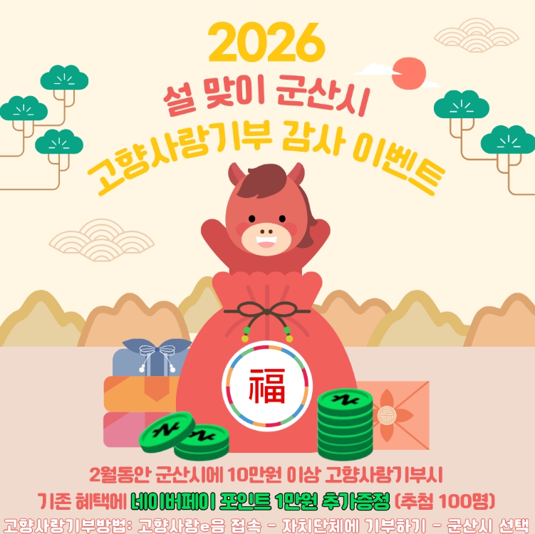 [뉴스앤톡] 군산시가 민족 대명절인 설을 맞아 고향사랑기부제 활성화와 기부 문화 확산을 위해 2월 한 달간 ‘설맞이 고향사랑기부제 특별 이벤트’를 진행한다.