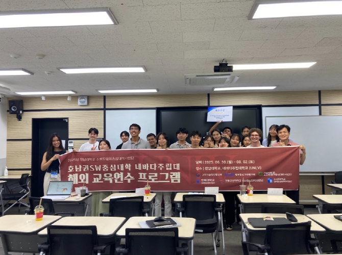 26일 전남대에 따르면 이번 해외교육연수 프로그램은 과학기술정보통신부와 정보통신기획평가원(IITP)이 지원하는 SW중심대학사업의 일환으로 지난 6월 30일부터 8월 2일까지 5주간 진행됐다. 프로젝트에는 전남대를 비롯해 전북대·조선대·군산대 등 호남권 4개 대학과 미국 네바다주립대가 함께 참여했다.