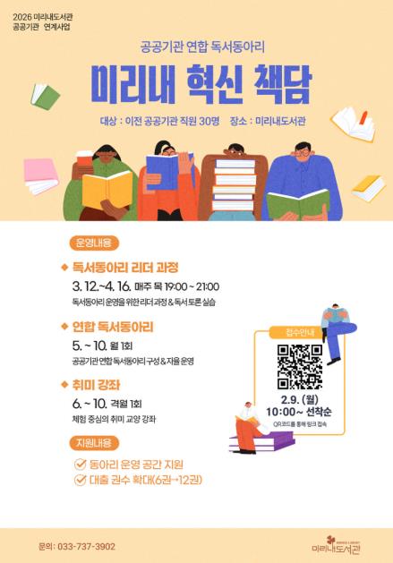 참여 신청은 2월 9일 오전 10시부터 운영 안내문의 큐알(QR)코드를 통해 선착순으로 접수한다. 자세한 사항은 미리내도서관 장서관리팀으로 문의하면 된다.