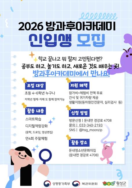 [뉴스앤톡] 횡성군 둔내청소년문화의집이 지역 청소년의 균형 있는 성장을 돕기 위한 ‘2026년 방과후아카데미’ 신입생을 모집한다.
