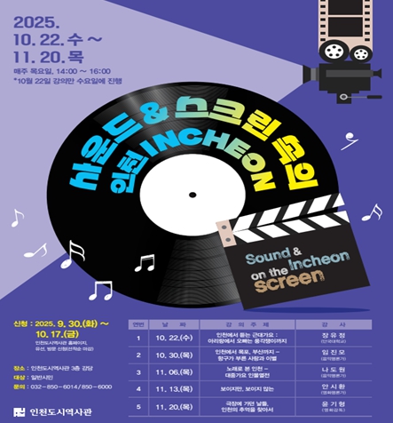 [뉴스앤톡] 인천광역시 인천도시역사관은 오는 10월 22일부터 일반 시민을 대상으로 ‘도시학당-사운드&스크린 속의 인천’을 운영한다고 밝혔다.
