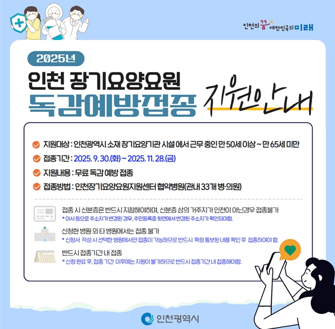 [뉴스앤톡] 인천광역시는 노인 감염취약시설인 장기요양기관 종사자 1만여 명의 건강권 확보와 처우 개선을 위해 오는 9월 30일부터 11월 28일까지 약 9주간 무료 독감 예방접종을 실시한다고 밝혔다.