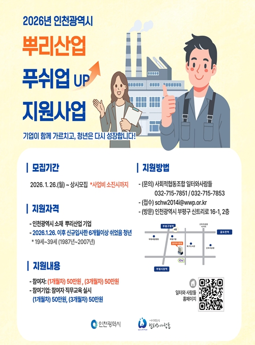 [뉴스앤톡] 인천광역시는 뿌리산업의 고용 안정성을 강화하고 청년의 노동시장 진입을 지원하기 위해‘멘토멘티 백일업(UP) 지원사업’과 ‘뿌리산업 푸쉬업(UP) 지원사업’을 추진한다.