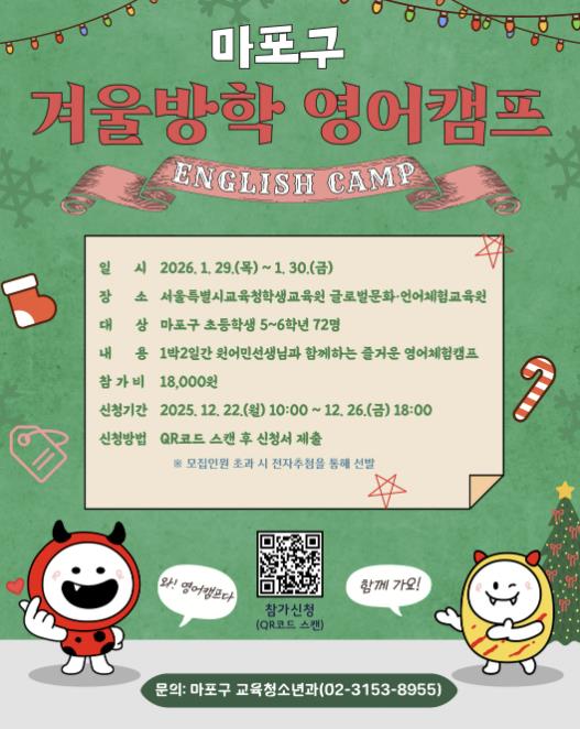 [뉴스앤톡] 마포구는 겨울방학을 맞아 관내 초등학교 5~6학년 학생 72명을 대상으로 2026년 1월 29일부터 30일까지 1박 2일 일정의 겨울방학 영어캠프를 운영한다.