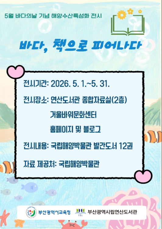 [뉴스앤톡] 부산광역시립연산도서관은 바다의 날(5월 31일)을 기념해 5월 한 달간 지역주민과 도서관 이용자를 대상으로 해양·수산 특성화 전시 ‘바다, 책으로 피어나다’를 운영한다.