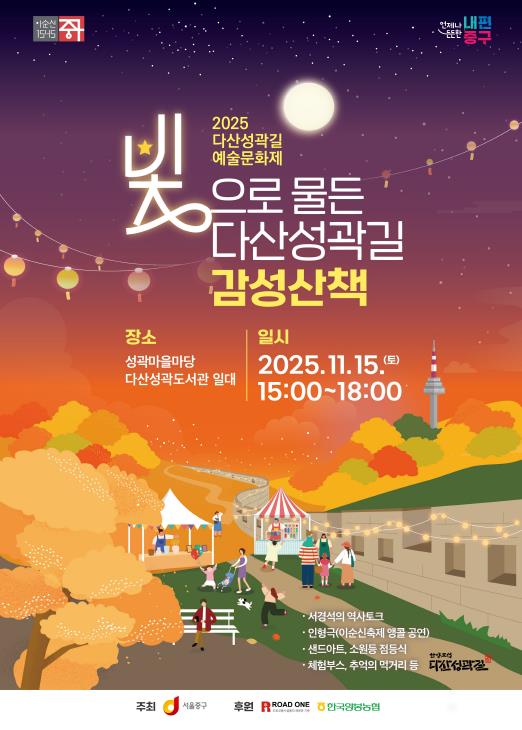 [뉴스앤톡] 서울 중구는 오는 15일 오후 3시부터 6시까지 다산성곽도서관과 성곽마을마당 일대에서‘2025 다산성곽길 예술문화제’를 개최한다. 중구 역사홍보대사 방송인 서경석 씨의 역사특강부터 청춘인형극단의 인형극, 소망등 점등식, 미리보는 성곽길 감성가로 샌드아트 등 다채로운 프로그램이 가득하다.